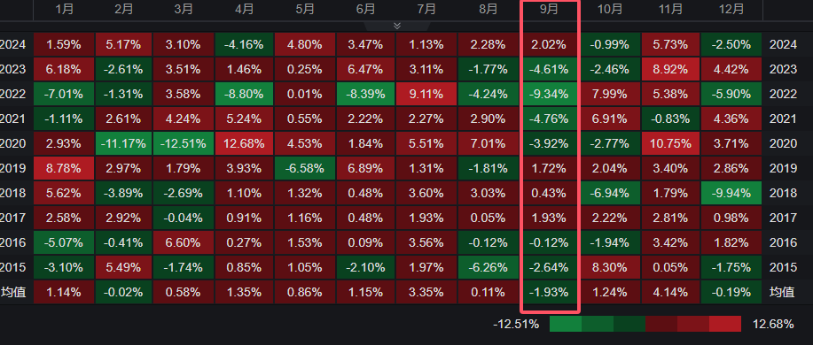 如下图所示,在夙昔十年里(2015年-2024年),标普500指数有六次在9月出现下落,平均跌幅为1.93%,为历月最遭,其中更是存在如2022年9月单月暴跌9.34%的“悲凄”案例。