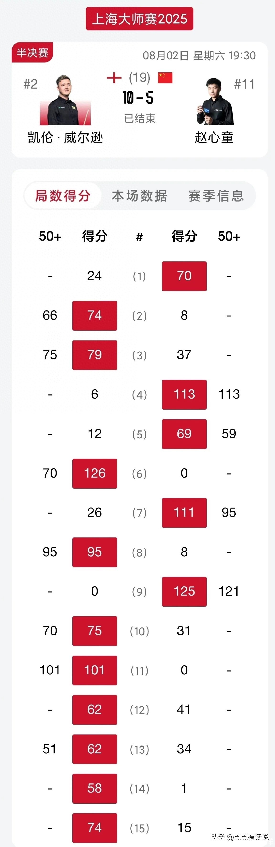 这场半决赛中,赵心童迎战英国选手威尔逊,比赛选定19局10胜制。
