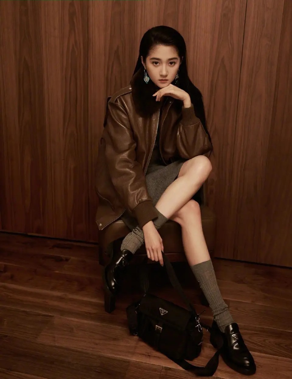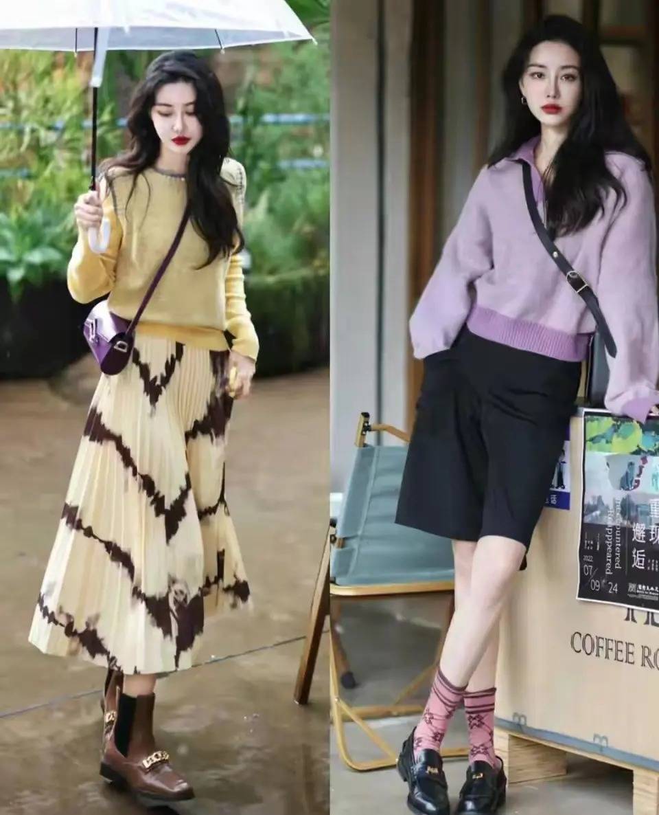 关晓彤的一稔配色也很值得我们模仿,取舍一稔齐是选那种淡色系,举例底下浅咖色的皮衣外衣搭配灰色的裙子,脚上穿的最为基础的玄色皮鞋,再加上灰色的中筒袜,就能穿出又酷又好意思的造型。