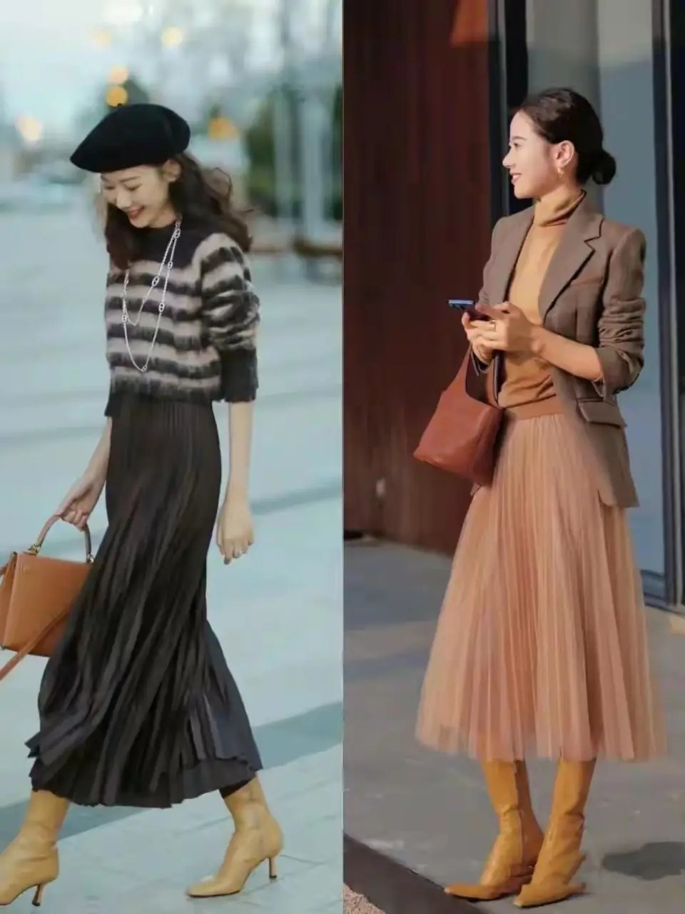 手脚职场女性的你,思让我方的穿衣打扮愈加干练,这技术保举你取舍一件翻领的低饱胀度的西装外衣,内搭驼色的半高领竭诚打底衫和一条百褶的薄纱半身裙组合,脚上取舍一对浅驼色的皮质中筒靴就够,这么的打扮通勤又端淑。