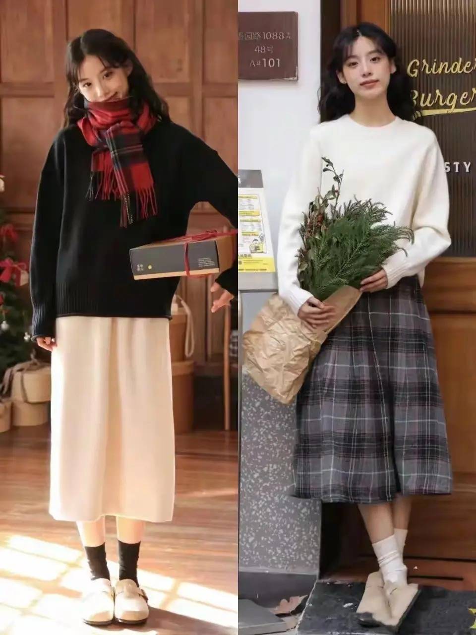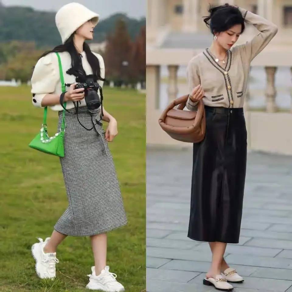 约略我们可以学习右边的这一套,穿搭的技术铭刻把衣角塞进裙子内部,亦然能很好的擢升腰线,不外有少许要详实取舍的裙子一定是高腰收腰款。