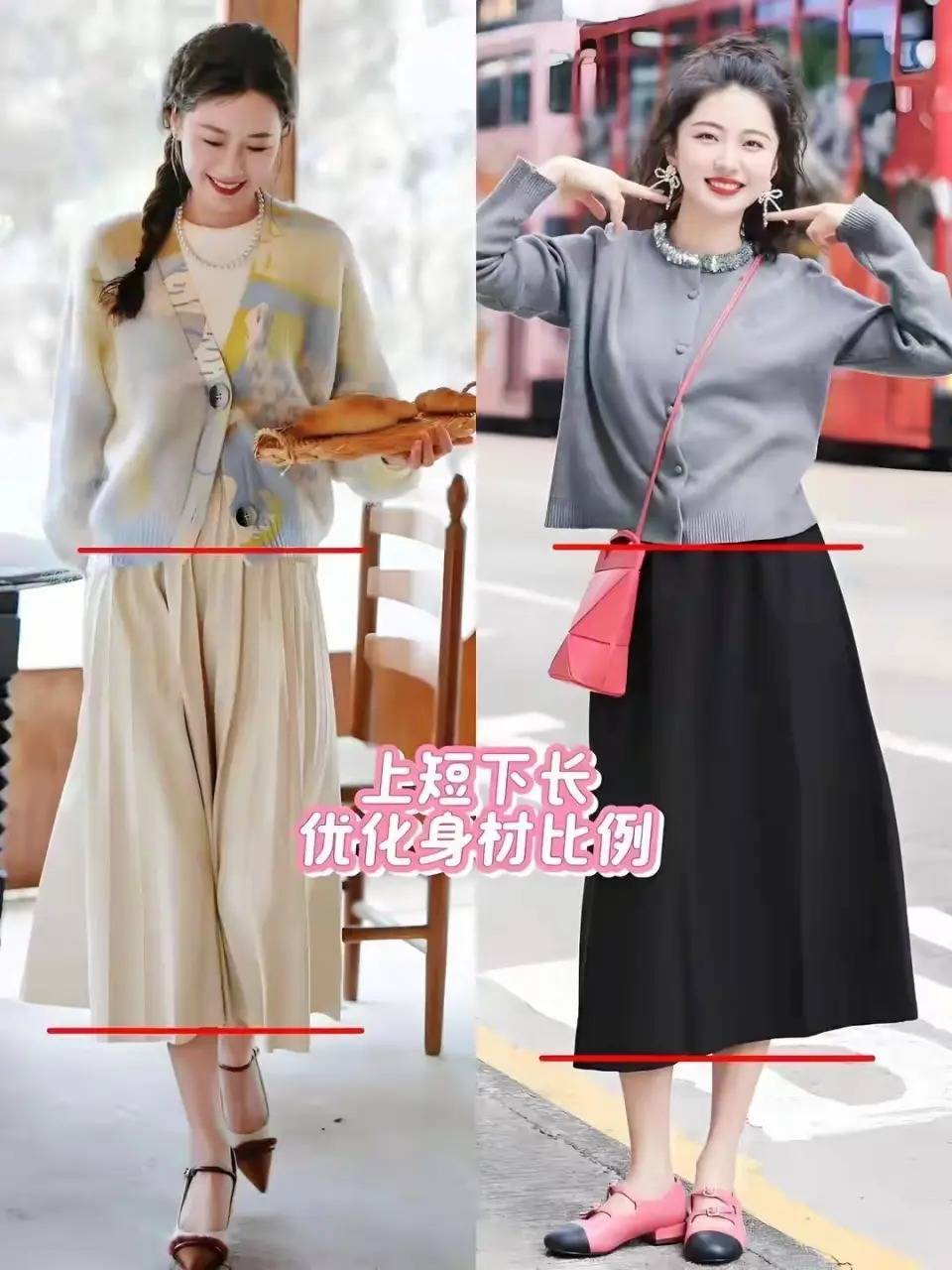 我们也可以取舍“上短下长”的搭布景色来优化我们的体魄比例,比如短款的灰色竭诚开衫配上高腰收腰款的玄色伞状半身裙,看起来就能让你达到显高显瘦的后果。