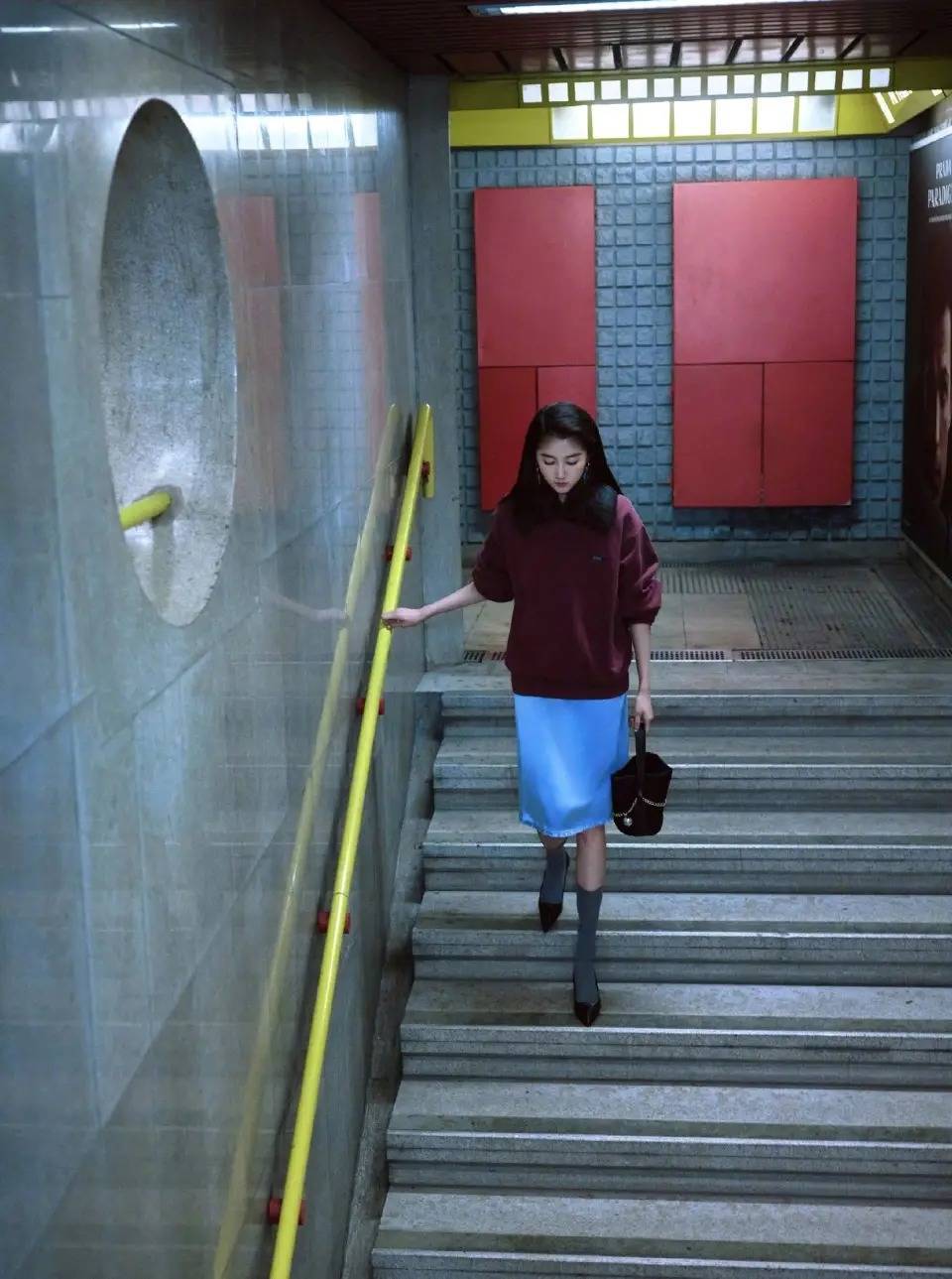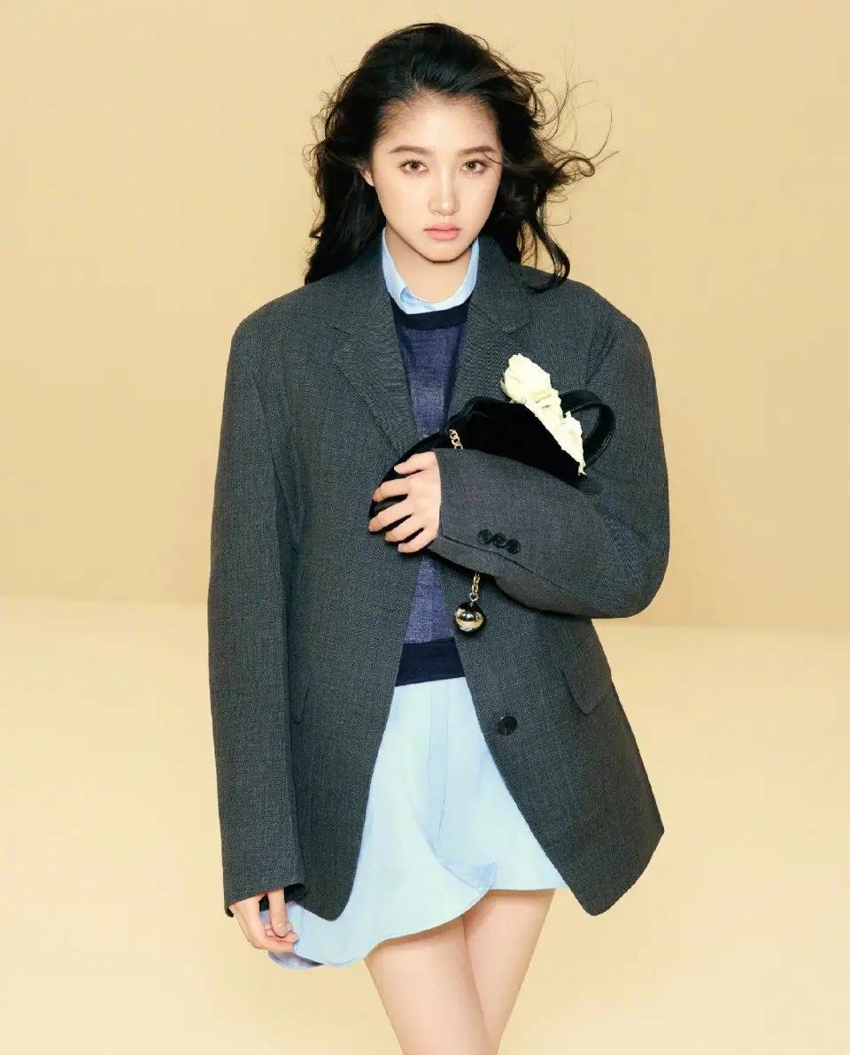 是以我们在穿衣打扮的技术,穿衣配色不要过于花哨,举例,关晓彤用一件最为基础的灰色西装外衣搭配紫蓝色的打底衫,叠穿浅蓝色衬衫,再加上一条蓝色的短裙,这么的穿衣配色造成一个撞色的后果,让悉数造型变得更有档次感。