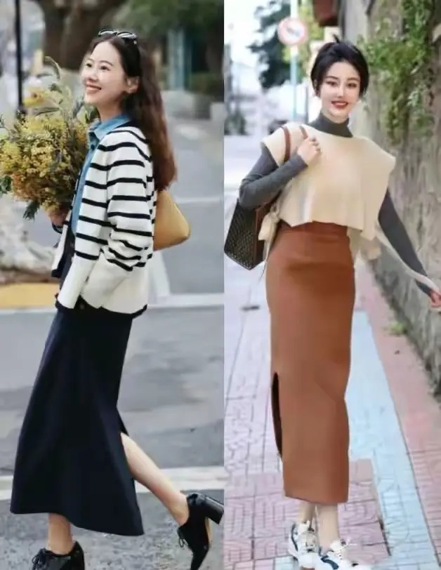 天然可以采用上短下长的搭布景色,然而千万不要过于刻意,比如,底下右边这一位达东说念主用的这一件白色的竭诚马甲,搭配上驼色的开叉直筒半身裙,合座的体魄比例就有点失衡,看起来没那么的雅瞻念。有的技术我们的穿衣打扮没必要过于刻意。