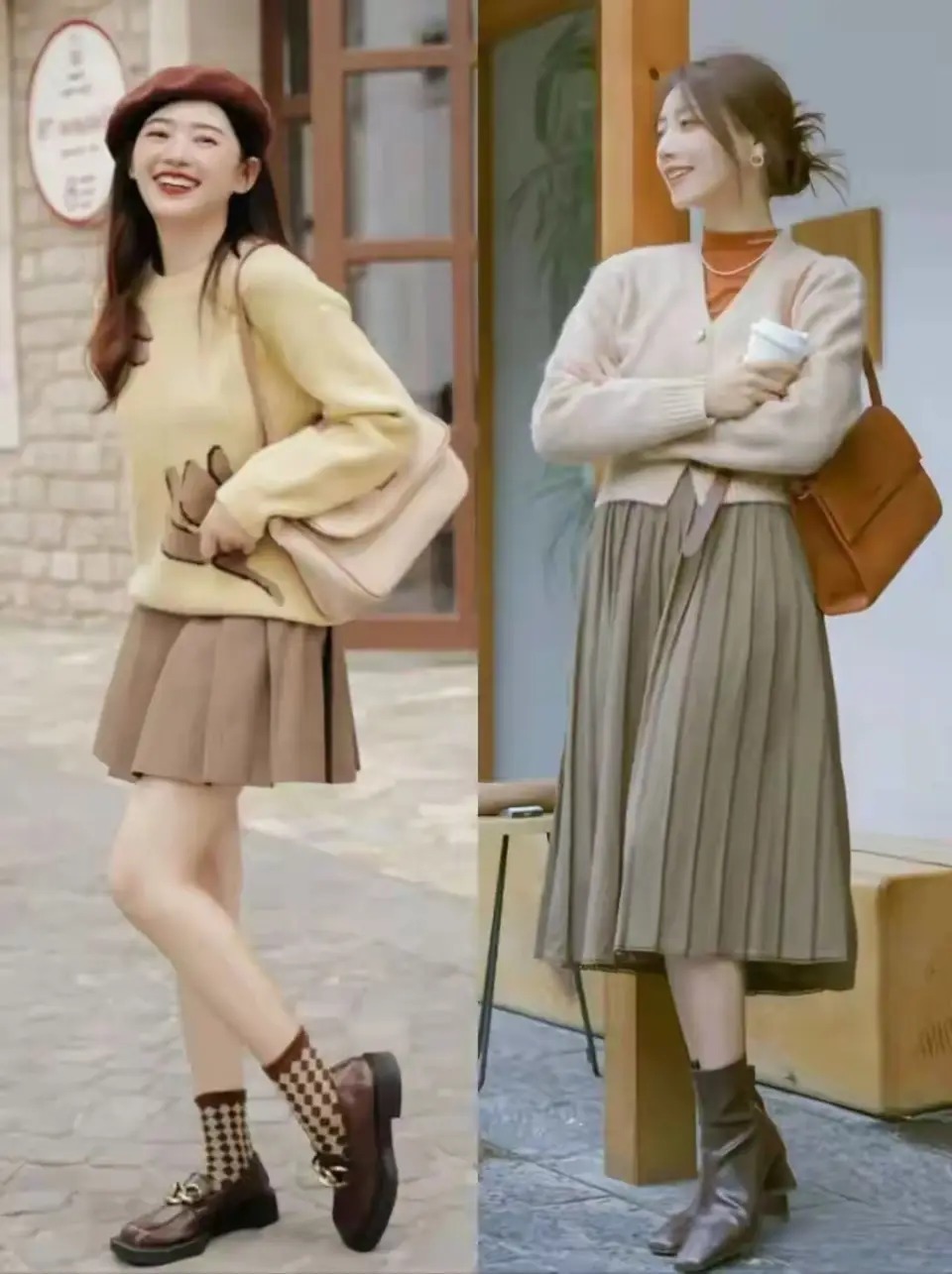 不外最为百搭的即是皮质的鞋子,底下这双棕色的乐福鞋,还有咖色的皮质短靴,搭配上短裙约略是百褶半身裙展现出来的后果,齐很洋气。