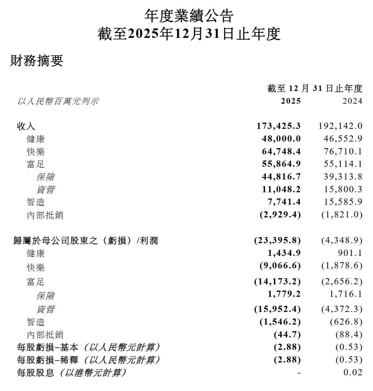 集团以“深度产业运营+产业投资”为双轮运行,中枢业务聚焦健康、温情、宽裕、智造四大板块,业务盛大医药、旅游、金融等多个界限。其中,组成宽裕板块业务的保障及资管(蜂巢类资管和投资类资管)呈现“冰火两重天”。财报表示,该板块2025年归母净蚀本141.73亿元,但蚀本扫数来自资管板块(蚀本159.52亿元),保障业务自身全面盈利。保障板块包摄于母公司股东之利润为东说念主民币1,779.2百万元,较2024年同期栽植3.7%。保障板块收入同比飞腾14.0%。2025年保障、蜂巢类资管和投资类资管收入差别占集团宽裕板块总收入的80%、9%及11%。