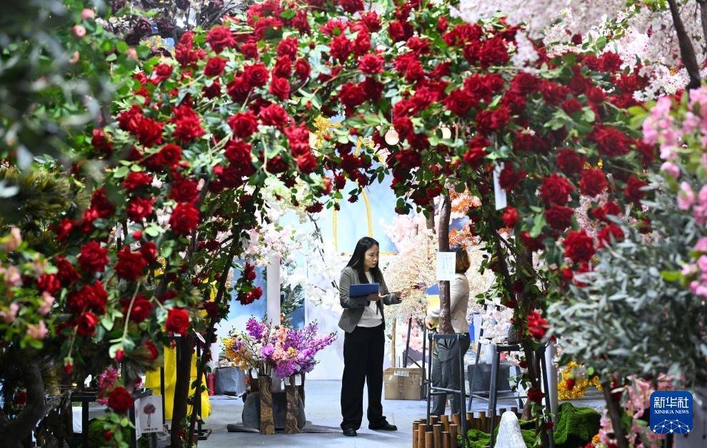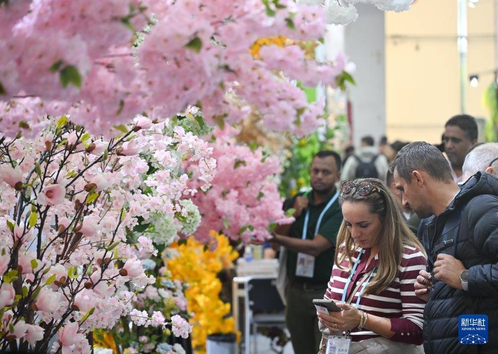 10月23日,职责主谈主员在仿真花展台洽谈。