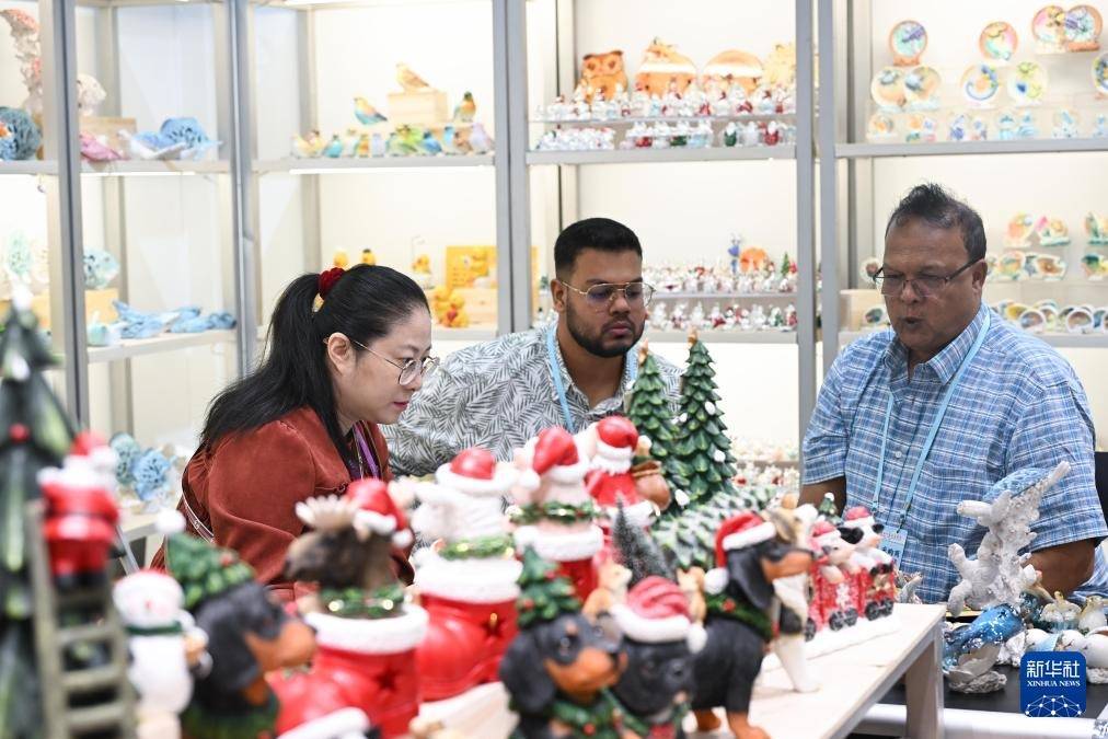 10月23日,境外采购商在日用瓷器企业展台洽谈。