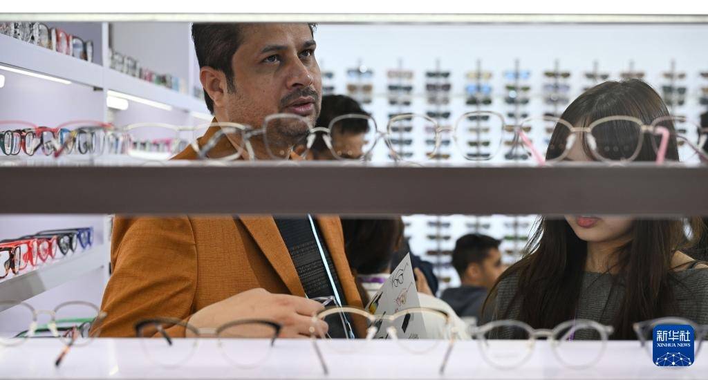 10月23日,境外采购商在眼镜展台洽谈。