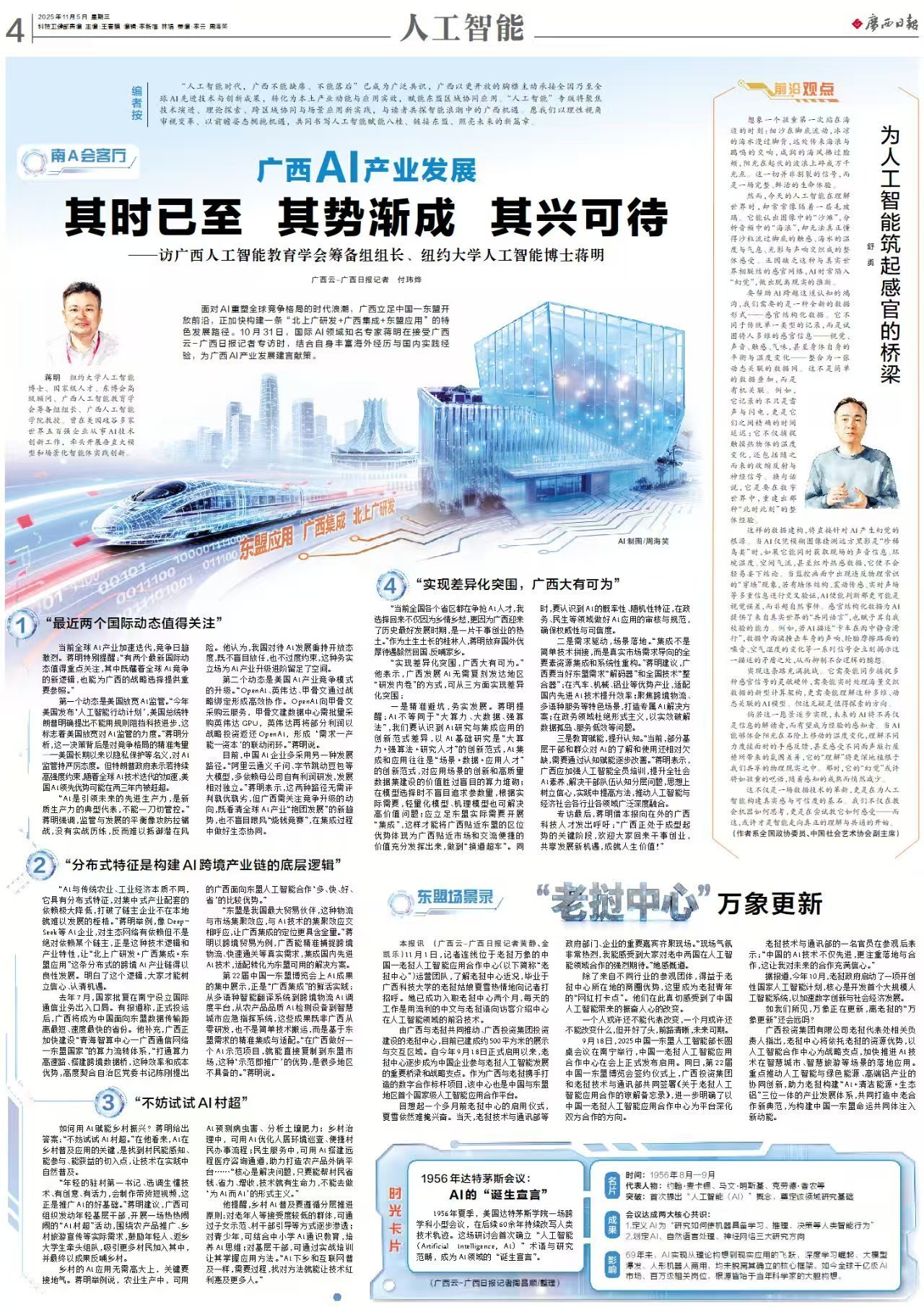 在人人东说念主工智能波涛奔涌、深化重塑产业与发展面貌的期间布景下,11月5日,广西日报在寰宇省级党报中最初推出“东说念主工智能专刊”,每周三推出一期,旨在以本色蜕变呼应科技变革,以版面实验彰显包袱担当,为广西打造中国—东盟东说念主工智能互助高地积攒机灵、注入动能。